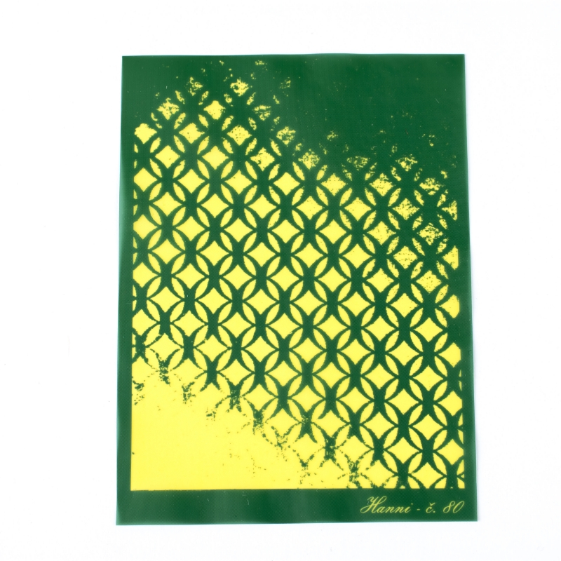 Egy új és látványos technika, mely segítségével könnyen készíthetsz egyedi ékszereket vagy más ajándéktárgyakat. Silk screen mellet csak akrilfestékre van szükséged! Készítsd elő a gyurma lapot, amire szeretnéd a mintát elkészíteni. Helyezd a silk sreen-t a fényes felületével lefele a gyurmára. Simíts rá finoman, hogy ne maradjon levegő a stencil és a gyurma között. Tegyél egy kis mennyiségű akril festéket egy plasztikkártyára és húzd végig rajta. Távolítsd el a stencilt a gyurmáról, és azonnal mosd el a silkscreen-t, ne hagyd,hogy a festék beleszáradjon. Hagyd megszáradni a festéket, és utána kész is a van. Mérete 7,5x10cm.